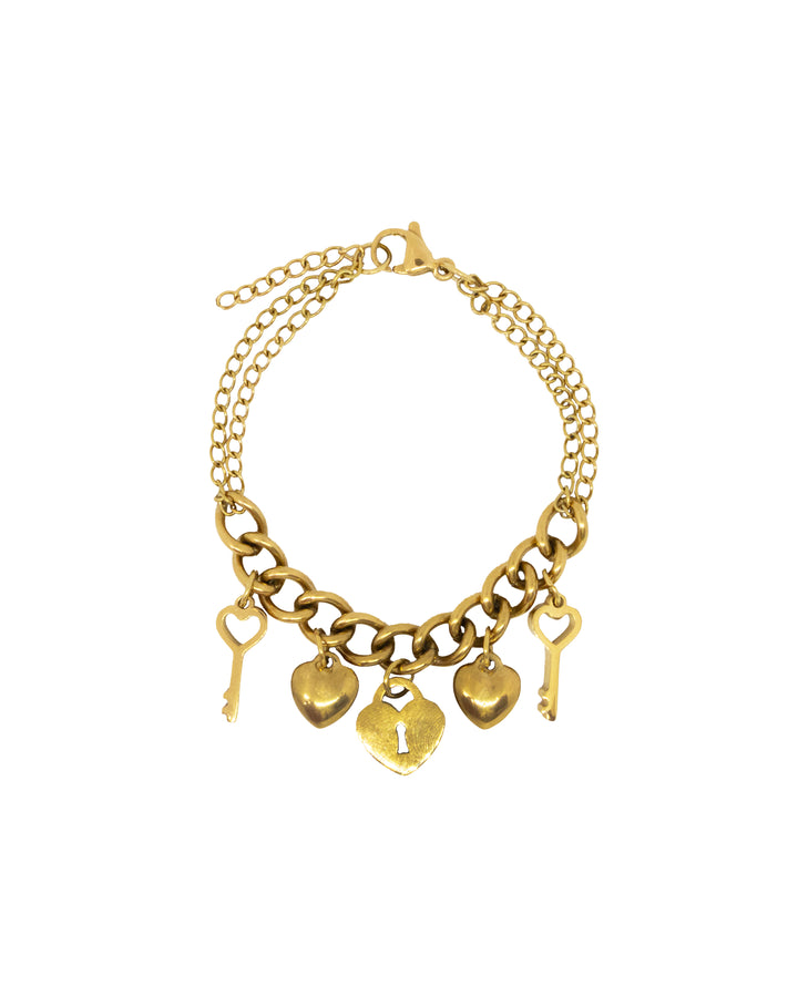 Deze verfijnde armband is een symbool van liefde en verbondenheid. Gemaakt van vintage premium stainless steel, blijft hij prachtig glanzen en is hij bestand tegen verkleuren of krassen. De armband is voorzien van een sleutelhangertjes en meerdere hartjes hangers, die samen een romantische en speelse uitstraling geven.