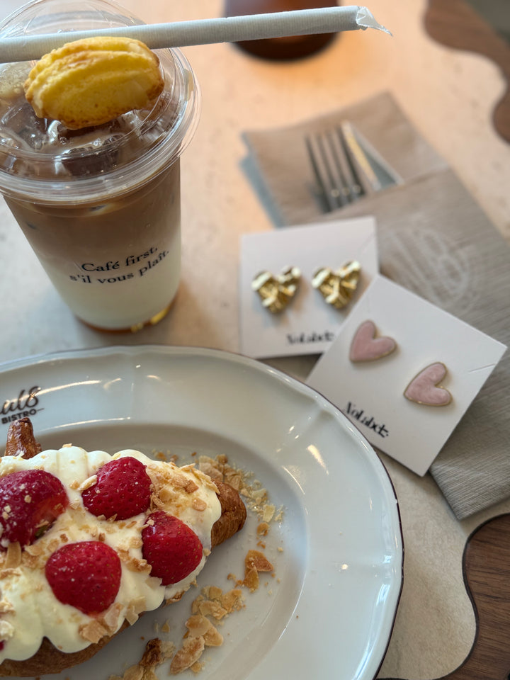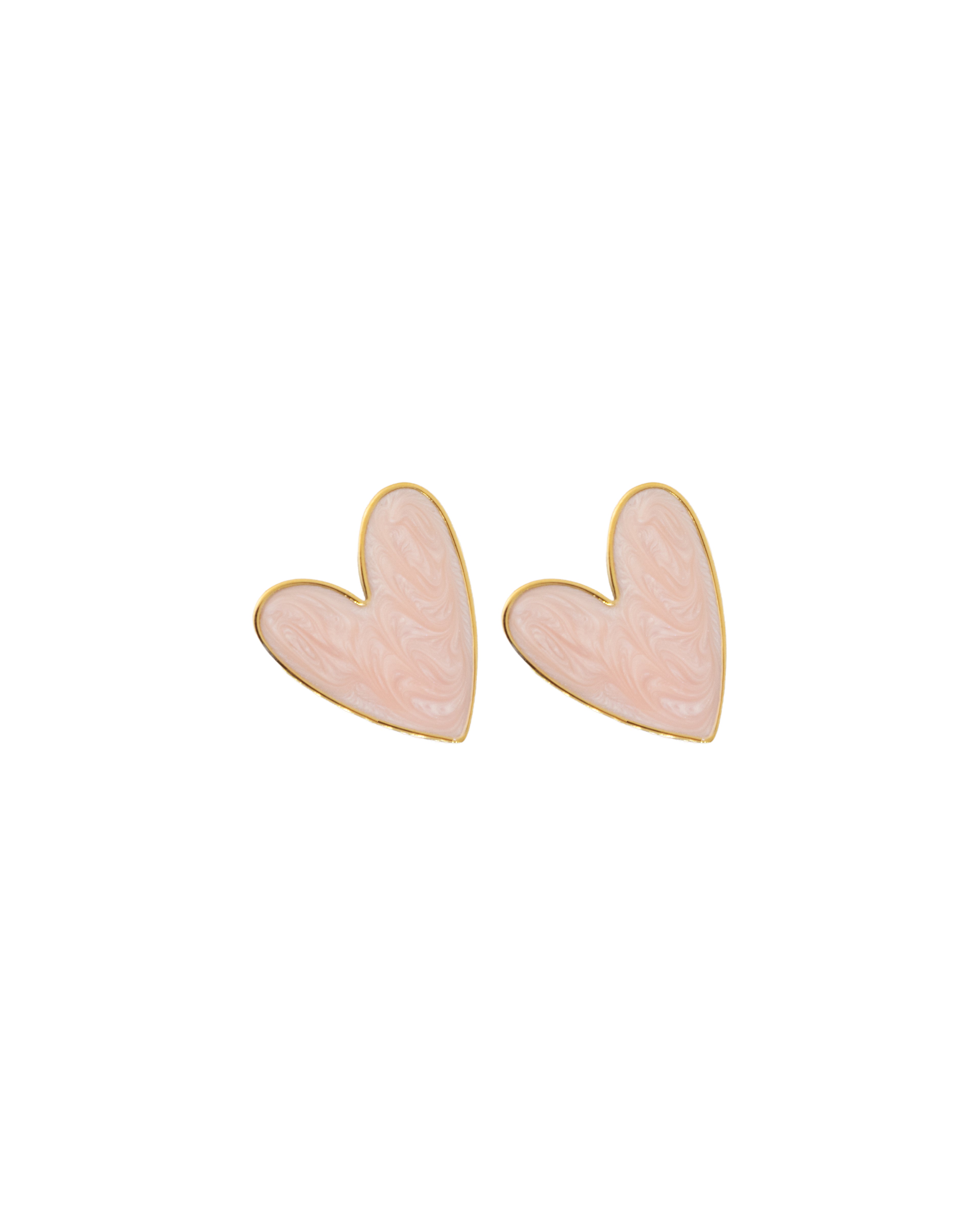 Oorbellen van stainless steel in een hart vorm met lichtroze afwerking.