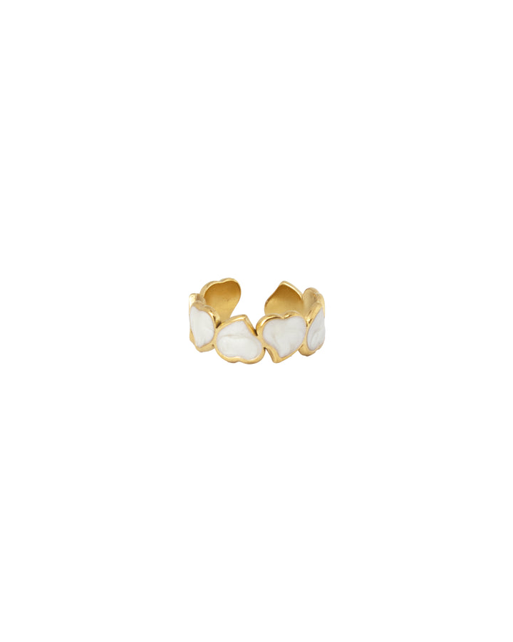 Verstelbaar ring van goudkleurig stainless steel, afgewerkt met witte hartjes.