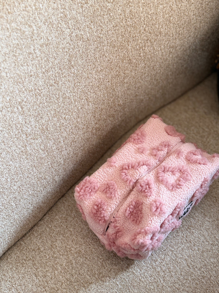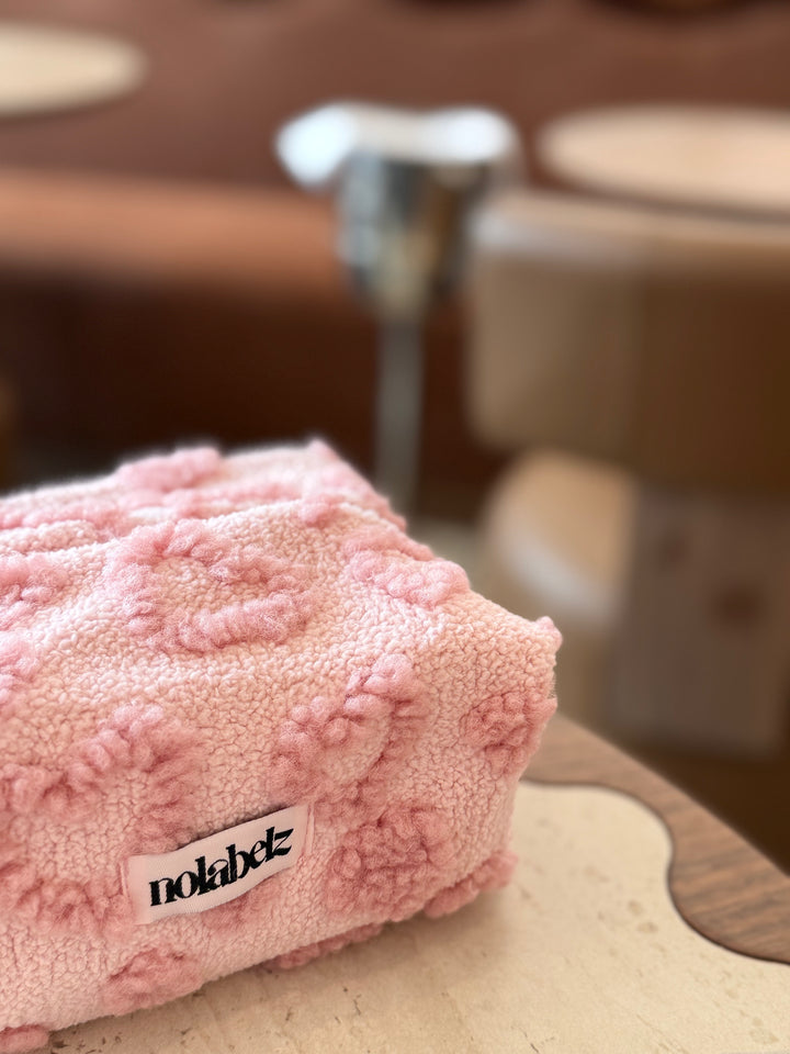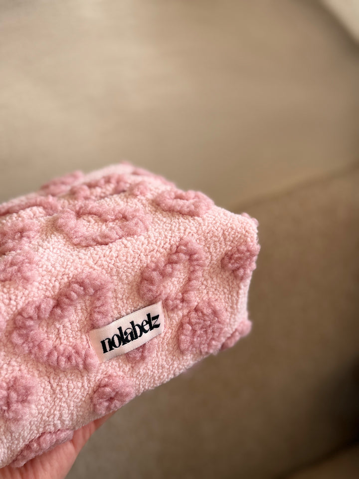 De Beauty Bag Ledeyna is een handgemaakte make up tas in zachte teddy stof, uitgevoerd in stijlvol roze en versierd met subtiele hartjes. Deze tas combineert een speelse uitstraling met een luxe gevoel en biedt genoeg ruimte om je make-up en verzorgingsproducten georganiseerd mee te nemen, perfect voor thuis én onderweg.