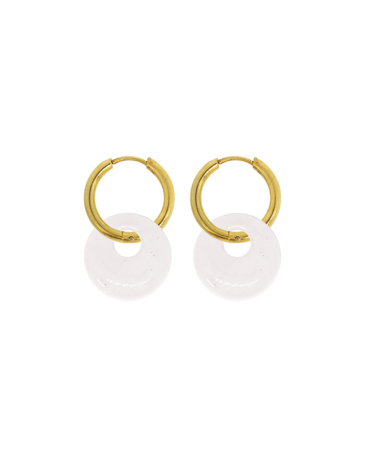 Oorbellen van goudkleurig stainless steel, afgewerkt met een elegante witte ronde hanger. Duurzaam, verkleuren niet en perfect voor een tijdloze, stijlvolle look.