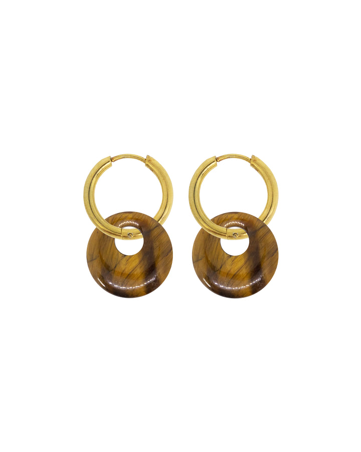Oorbellen van goudkleurig stainless steel, gecombineerd met een elegante bruine ronde hanger.